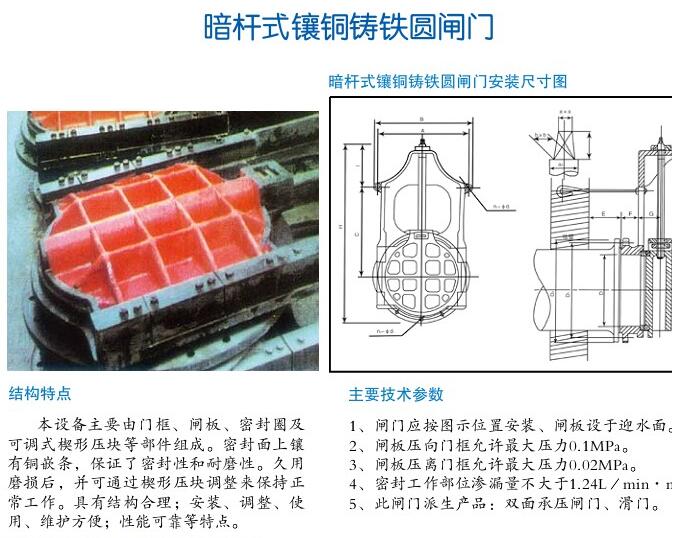 本設(shè)備主要由門(mén)框、閘板、密封圈及可調(diào)式楔形壓塊等部件組成。密封面上鑲有銅嵌條,保證了密封性和耐磨性。久用磨損后,并可通過(guò)楔形壓塊調(diào)整來(lái)保持正常工作。具有結(jié)構(gòu)合理;安裝、調(diào)整、使用、維護(hù)方便;性能可靠等特點(diǎn)。