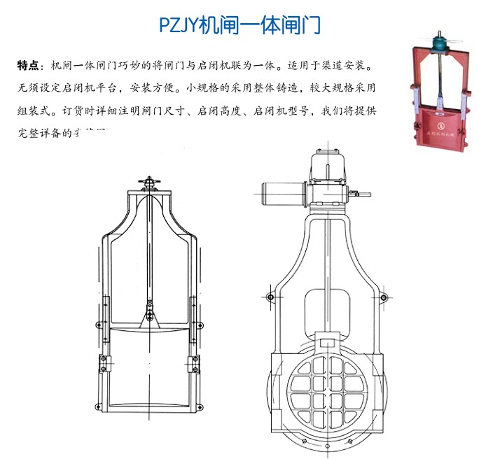 機(jī)閘一體閘門巧妙的將閘門與啟閉機(jī)聯(lián)為一體。適用于渠道安裝。無須設(shè)定啟閉機(jī)平臺,安裝方便。小規(guī)格的采用整體鑄造,較大規(guī)格采用組裝式。訂貨時詳細(xì)注明閘門尺寸、啟閉高度、啟閉機(jī)型號,我們將提供完整詳備的安裝圖。